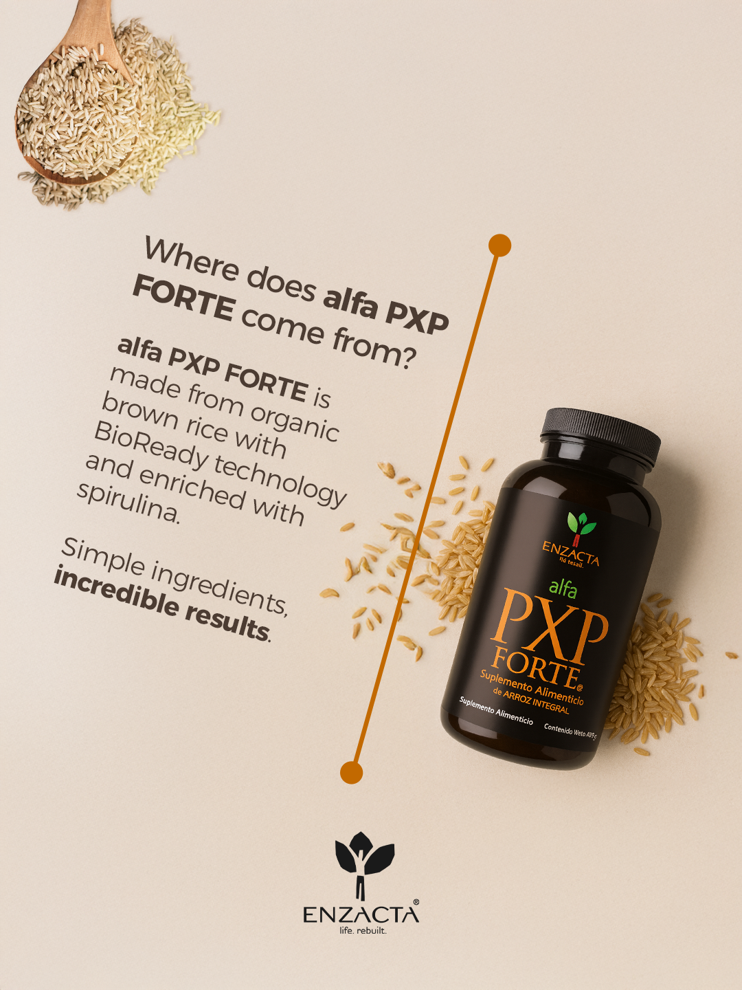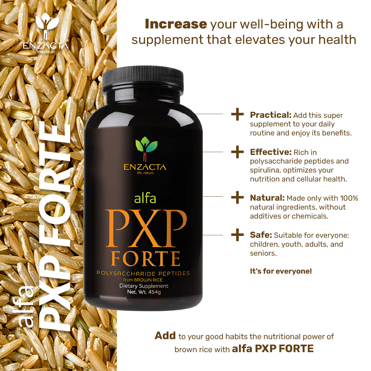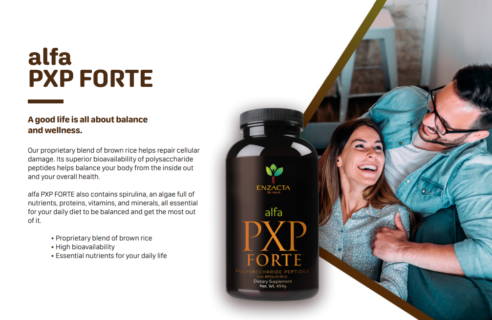 alfa PXP FORTE harnesses all the essential superfood nutrients from brown rice harvested at its best stage. It is a high-quality organic rice from Thailand, rich in peptide polysaccharides, essential amino acids, antioxidants, and enriched with spirulina algae. These ingredients work together to help your body function at its best. Thanks to its BioReady technology, it is absorbed directly by cells.